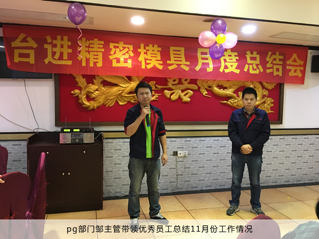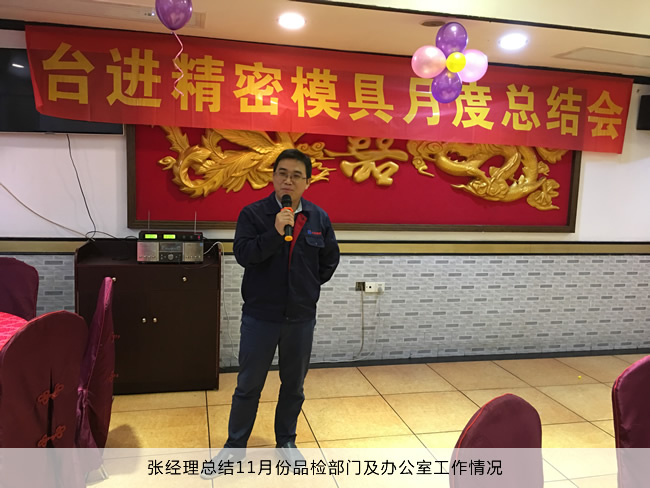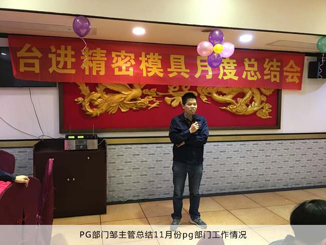 大会的第一阶段,JG、PG、磨床、线割、品检、办公室各个部门的主管、经理依次上台发表月度总结,总结了11月份做出的贡献和团队存在的不足。最后由黄总对11月份的工作做出最后的总结。